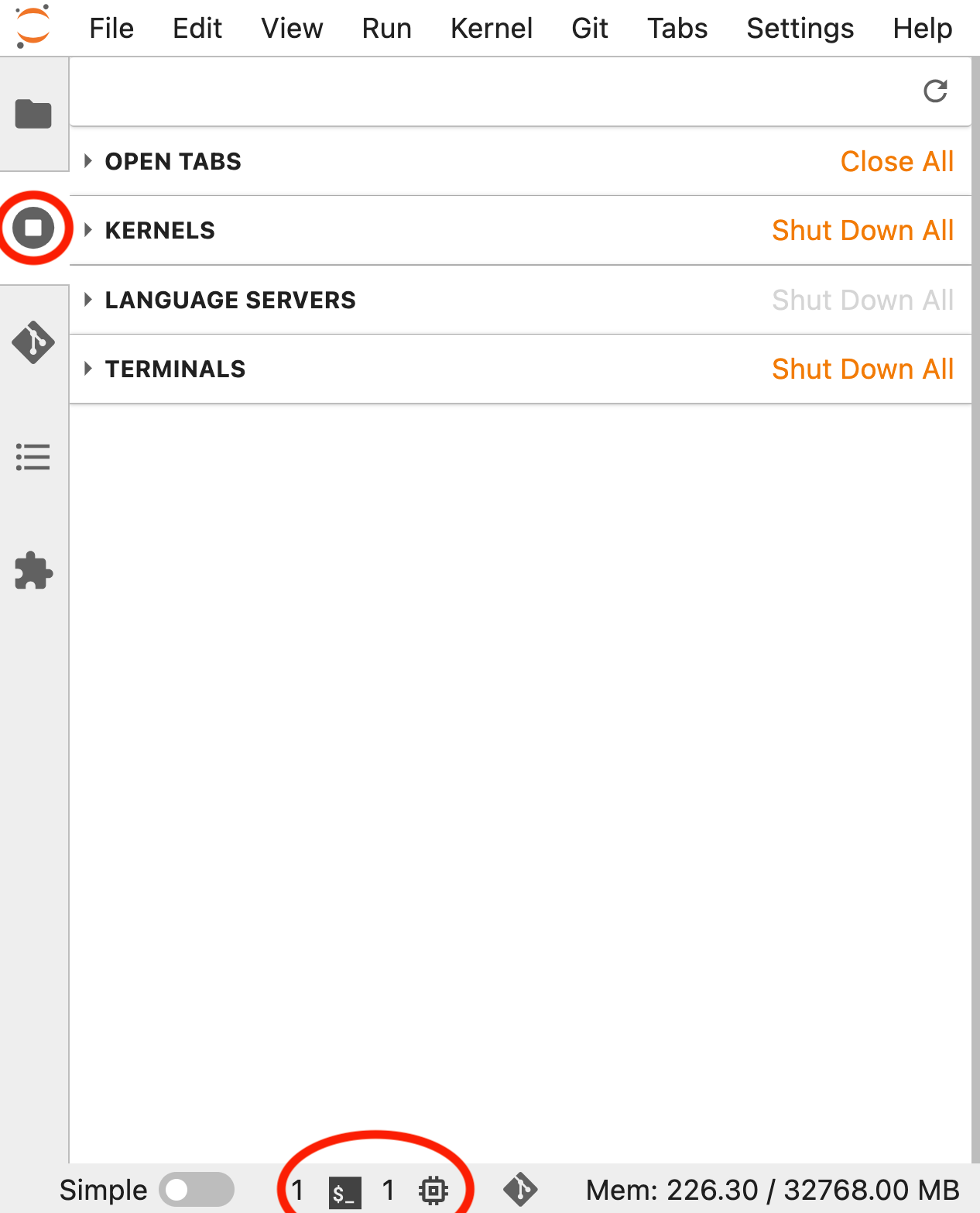 After some intense coding and analysis, it can happen that you have many terminal and notebook tabs open. However, simply closing them does not quit the processes and running kernels in the background. Therefore, we recommend that you tidy up your running processes after some time, which can be done as marked by the top-left circle. As an overview, the number of running kernels and terminals are always shown at the bottom-left corner.