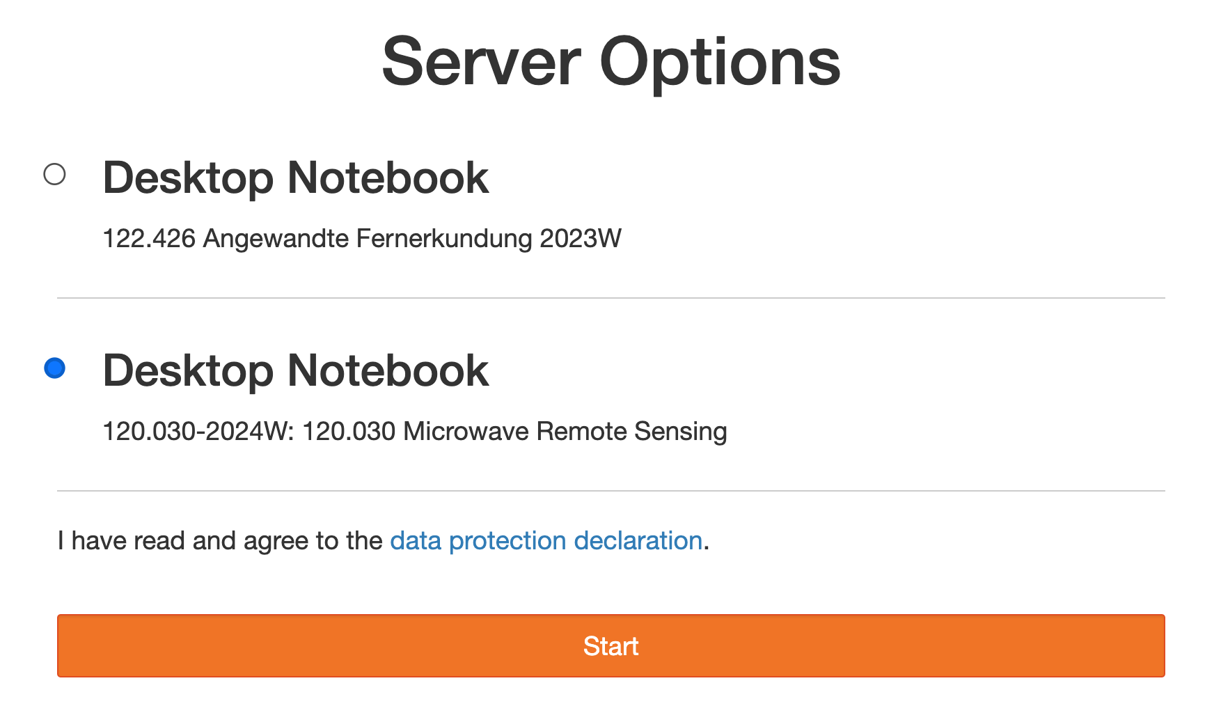 In TUWEL, click on the JupyterHub icon , which redirects you to your own JupyterLab user environment. You should then select the Server for the Desktop Notebook from the Microwave Remote Sensing course. Be patient - this can take a couple of minutes.