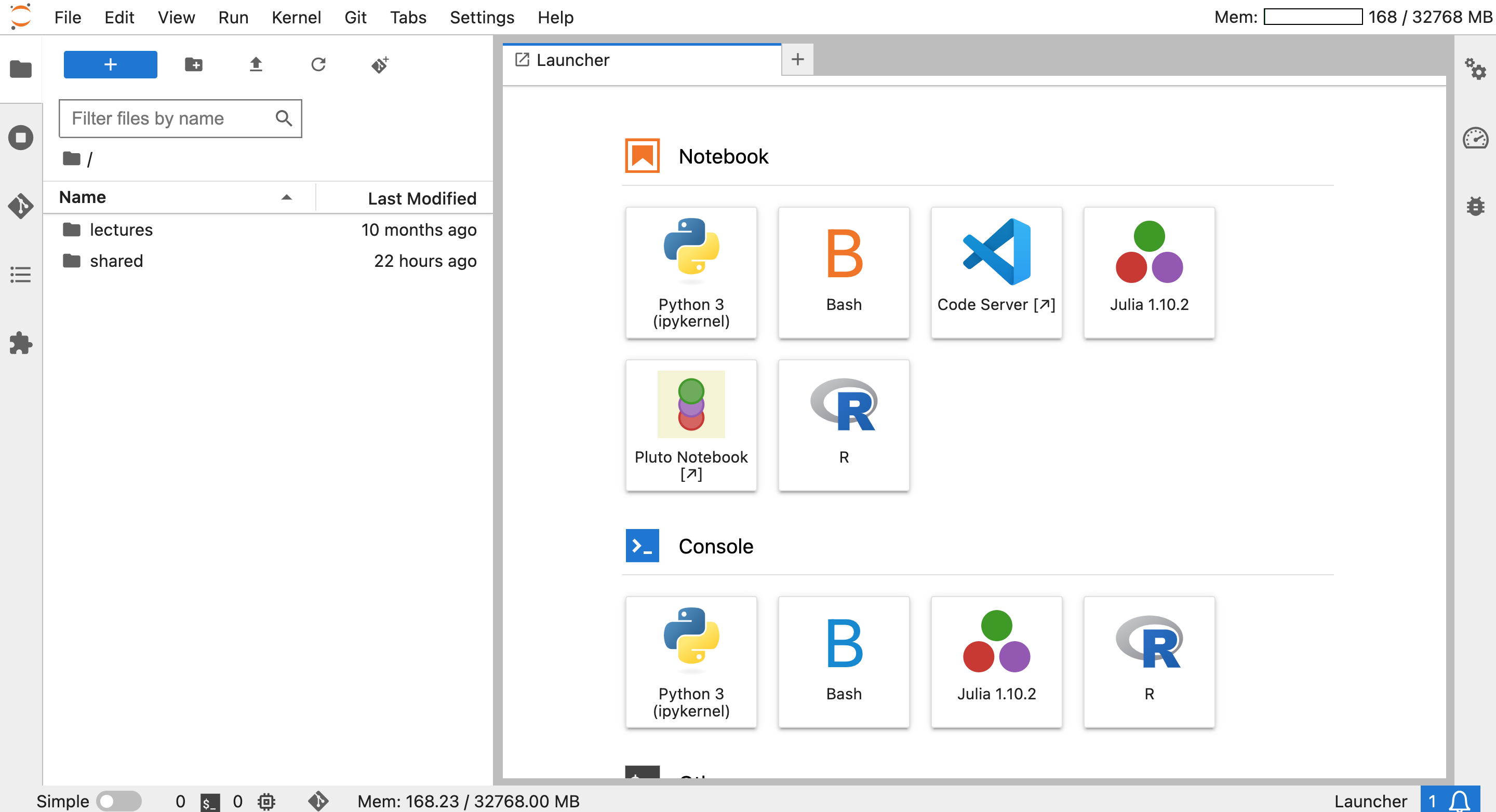 In the center, you have the Launcher where you can create Python or other files, play around with Jupyter Notebooks, store intermediate data. You can also open a Python console, a terminal, a text file, and many more. On the left, you can see your home directory where you have the folders lectures